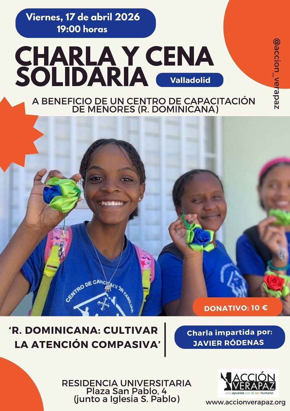 Antes de la cena, contaremos con una charla de Javier Ródenas, voluntario de Acción Verapaz, quien ha conocido de primera mano este proyecto. Su intervención, titulada “República Dominicana. Cultivar la atención compasiva”, nos acercará a la realidad que queremos apoyar.